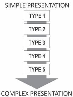 Due to presentation complexity one can distinguish different cartographic presentation types – in other words, cases in which different combinations of presentation methods and forms are applied. These start from the simplest solutions (type 1) and progress to complex solutions in which numerous presentation methods are applied simultaneously (types 2–5).