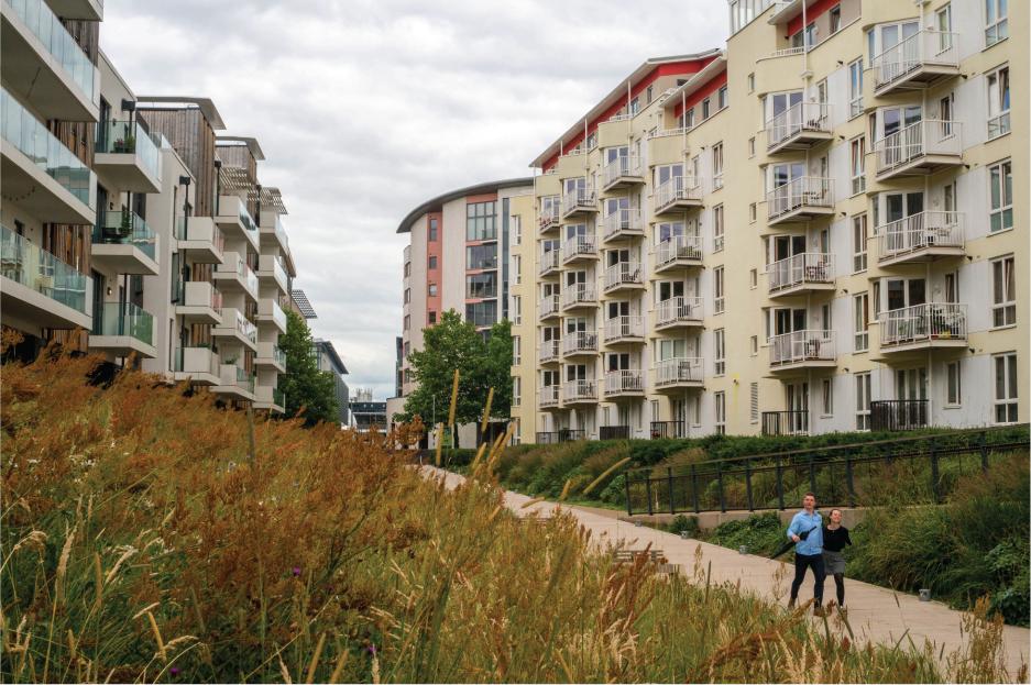 The designers of the Bristol Harbourside Development emphasised that community was an important factor in planning the estate structure, so they started with extensive public consultation. This outreach resulted in the construction of a multifunctional complex of buildings of high utility, which provided housing, services, and recreational space (Fig. 5). All inhabitants had access to the new attractive public space because there were neither physical barriers (only one of the housing complexes was enclosed) nor economic ones (the prices of houses and services were diversified). The development is connected with the urban structure of the inner city by a system of pedestrian routes. The network of green infrastructure strengthened the city ecosystem (Cullinan Studio 2017; Grant Associates 2017). In terms of foundational ideas, the project was based on legible narration, emphasising the relationship of the city with water as well as a sequence of landscape interiors and public spaces. Connections with the dominants of the urban structure of the city are important elements of the composition – there are scenic axes leading to the cathedral, harbour and the Great Britain museum ship, as well as wide scenic openings to the River Avon (Fig. 6). City art also plays a significant role in the space. Outstanding European artists were employed to design the integration of individual places with the city landscape. Apart from spatial, scenic, architectural and artistic concepts, the design also includes special environmentally friendly solutions: sustainable urban drainage, which directs the flow of rainwater from roofs into a system of irrigation canals, and adequately selected plant habitats (an extensive green wall and reed beds, which are responsible for microclimate regulation, water retention and maintenance of biodiversity (Grant Associates 2017).