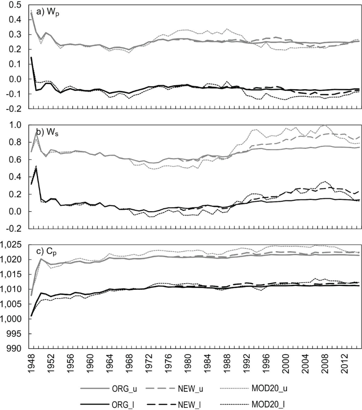 The thresholds for the classes of the indices Wp (a), Ws (b) and Cp (c) for 16 January 1948-2015. ORG_u – the upper threshold for the ORG classification; NEW_u – the upper threshold for the NEW classification; MOD20_u – the upper threshold for the MOD20 classification; ORG_I – the lower threshold for the ORG classification; NEW_I – the lower threshold for the NEW classification; and MOD20_I – the lower threshold for the MOD20 classification.
