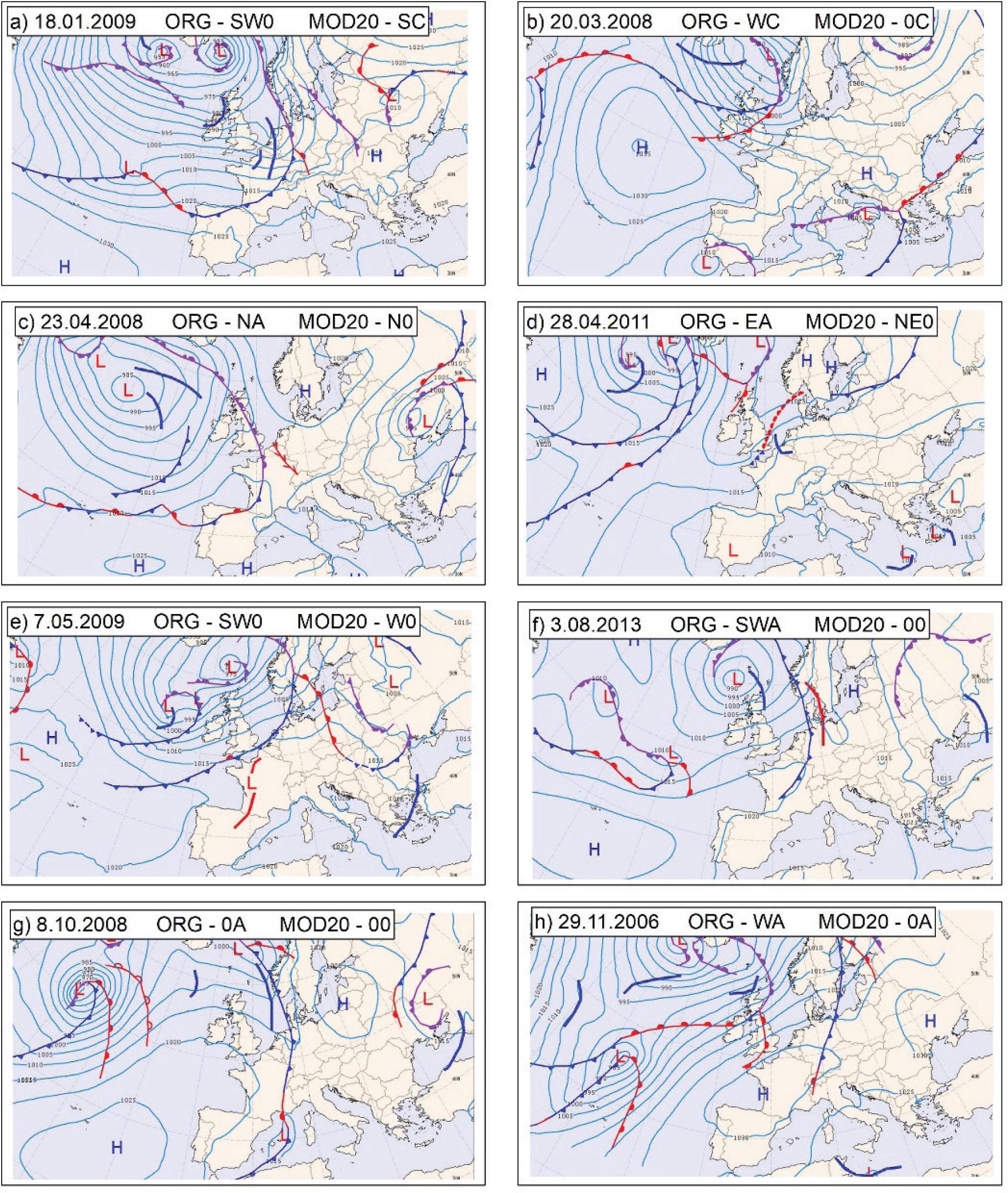 Atmospheric circulation types determined using the ORG and MOD20 classifications in comparison with synoptic charts for selected days at 12:00 UTC. Variant names are explained in the text.