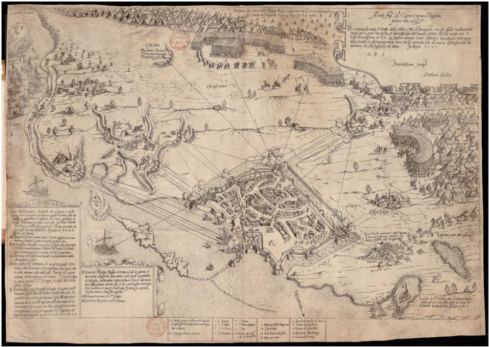 The walled city underwent changes to improve its defences at the beginning of the 14th century, with the enlargement of the inner castle, the strengthening of the fortifications and the remodelling the main squares (Edbury 1999). Later, during the Venetian era, the fortifications were further renovated to face a possible Ottoman invasion. The Ottoman Empire commenced its conquest of the island in 1570 and by October, they had already taken almost all of Cyprus’ cities including the capital Nicosia, after which their attention turned to Famagusta, the last city remaining for the Ottomans’ victory over Venetians to be complete. Following the invasion in 1571, the island became a part of the Ottoman Empire. It was during these years of siege, that the city played an important role in the war between the ruling powers of the Mediterranean. So detailed maps were created to represent and identify the city in detail.