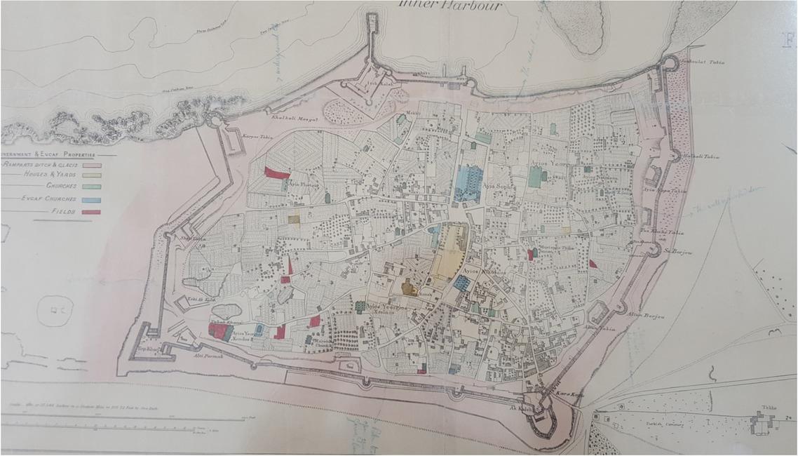 The map was made during the survey under the command of Lieutenant S.C.N. Grant (Fig.3). It shows the inside of the walled city in detail, showing the public buildings, fields and private building complexes. It also gives names of few churches, bastions and the land gate. The Greek names of the churches were given and the converted churches are not emphasized by omitting their Turkish names. The Turkish names are only given for the bastions. The surprising thing about this map is the erroneous labelling of two important churches: St. Nicholas Cathedral is the biggest structure in the middle of the city and is labelled as “Ayia Sophia” and Saints Peter and Paul “Ayios Nikolaos”. Different usage of the churches during this era is not emphasized on the map. Other than these structures, inside the walled city surprisingly only one mosque, Mustafa Pasha Mosque is shown because the name of the church was unknown by this time (Enlart 1987) and the second structure was a mansion called “konak”. The yellow painted areas show houses where the by now partially demolished Venetian palace used to be. The agricultural areas are still inside the walled city showing that this is a map from the early period of the British era. The sea gate, which was replaced during this era is not represented. The private buildings are depicted as blocks without any details. Outside the city walls, there isn’t much to illustrate except the Turkish cemetery and the Tekke which is a monastery for dervishes.