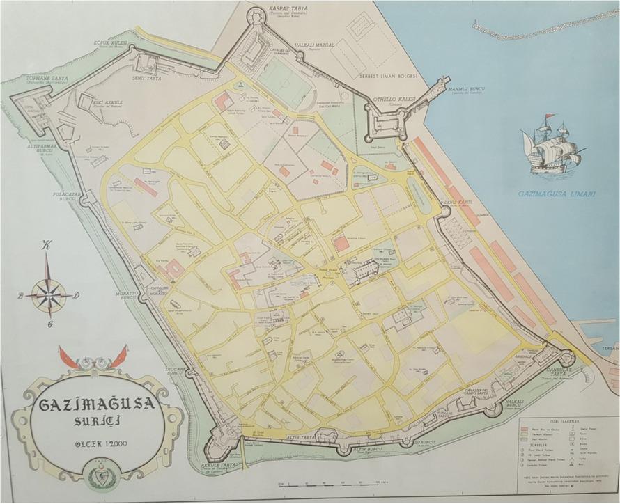 Yellow is used to show areas of increasing population and green to show empty areas like parks stadiums and the moat. New buildings such as schools, the stadium, the library and administration buildings are shown in red. The new gate between Torion del Mezzo bastion (Köpük Kule) and Torion del Diamate bastian (Karpaz Tabya), which was opened in 1965, can also be seen. According to the Project, in the 1990’s some of the roads were closed to the traffic e.g. İstiklal and Sinan Paşa streets. However, the differences on the street plan are not reflected. The map is not detailed enough to show us the irregular settlement and developments that the city underwent in recent decades. Modern maps became more detailed. Although, they could not fully represent the city or its historical and social background, they helped to administrate the city and surroundings.