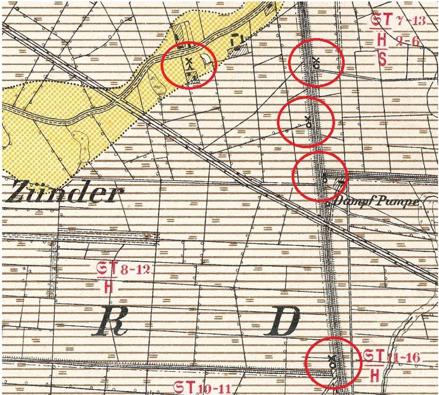 The identification of drainage windmills is an important issue (Fig.2). These are usually marked as vertical windmills with a rotating cap with the base in the form of a wheel. Sometimes, the wheel looks like of the symbol for a watermill. In fact, the drainage mills used in Żuławy could be divided into hollow post mills and smock mills (Bertram 1925). Therefore, regardless of the type, windmills were generally assigned as being drainage windmills. Luckily, in most cases, a note – ‘Entwasserung Mühle’ – gives information about their function.