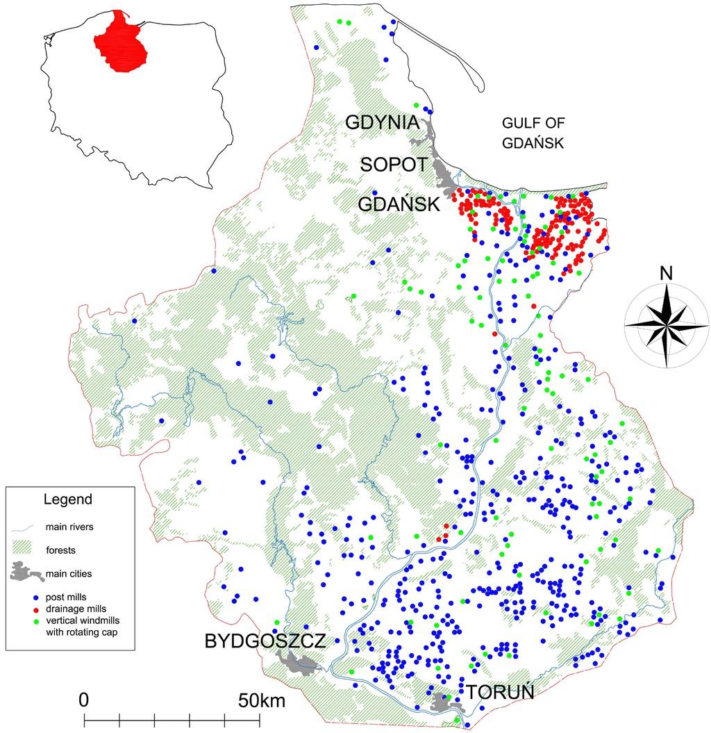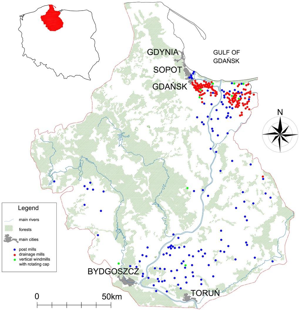 As for the Middle Ages, an analysis was made by Kubicki (2012) which was based on diverse written sources. The distribution and types of windmills, including their current state of preservation, was only presented for Chełmno Land (Prarat 2016) and the area of today’s Kujawsko-Pomorskie voivodeship (Brykała et al. 2015); whereas issues related to watermills were demonstrated for the whole basin area of the Lower Vistula River (Podgórski 2004; Brykała 2018).