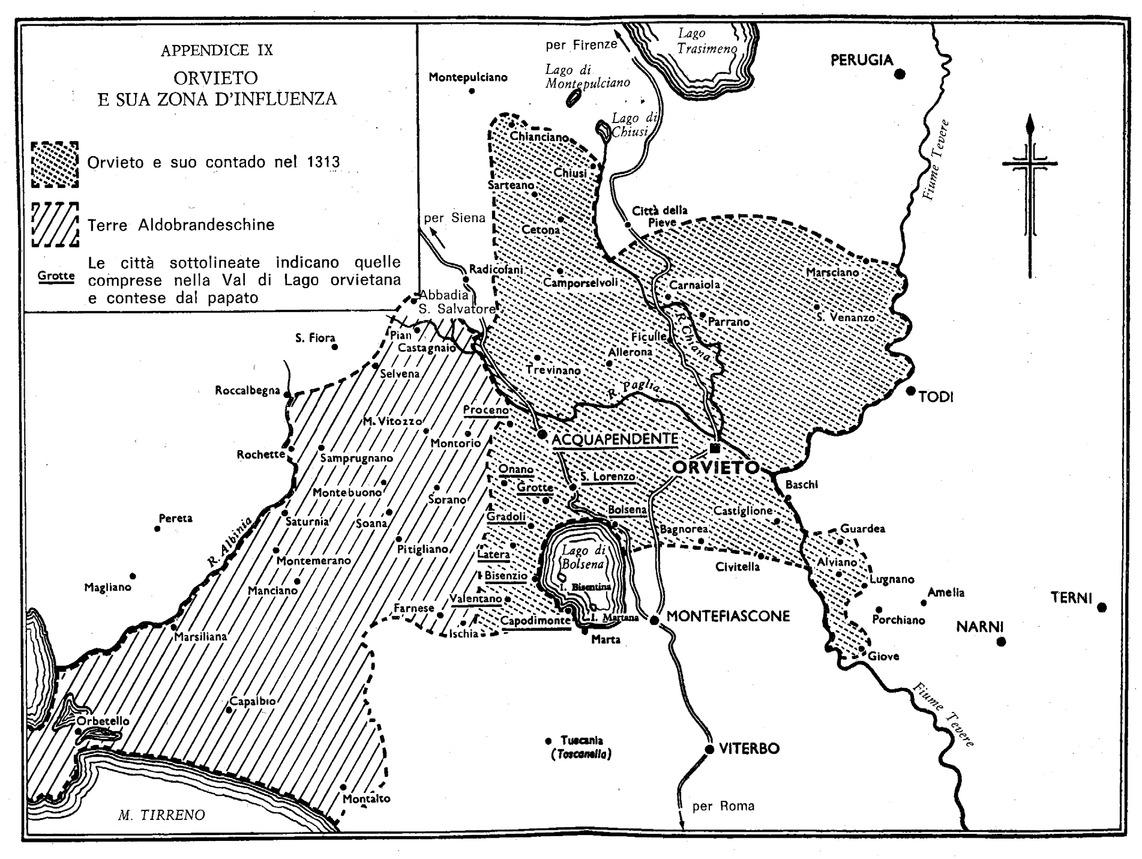Orvieto Sphere of Influence. Source: Waley 1952. Dotted area maps Orvieto and its contado in 1313, the diagonal lines identify Maremma region, cities underlined where claimed by Orvieto and the Pope