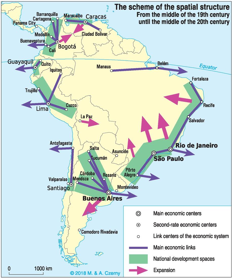 A schematic representation of spatial structure of South America from the late 19th through to the mid-20th centuries