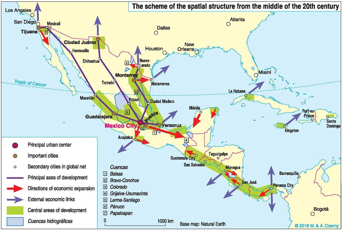 A schematic representation of spatial structure of Central America from the second half of the 20th century