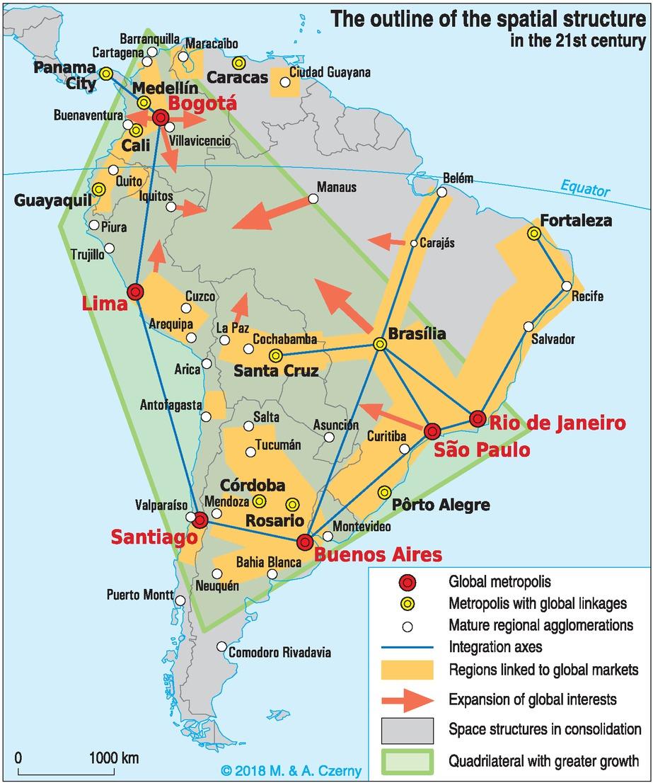 A model of islands of development as regards peripheral regions, which was inherited from colonial times, is giving way to a nodal/linear model, also as a result of centrifugal forces and the clear dynamic characterizing economic growth in the Latin American states since the beginning of the 21st century.