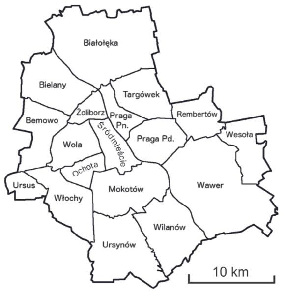 Map of Warsaw and its 18 districts.
