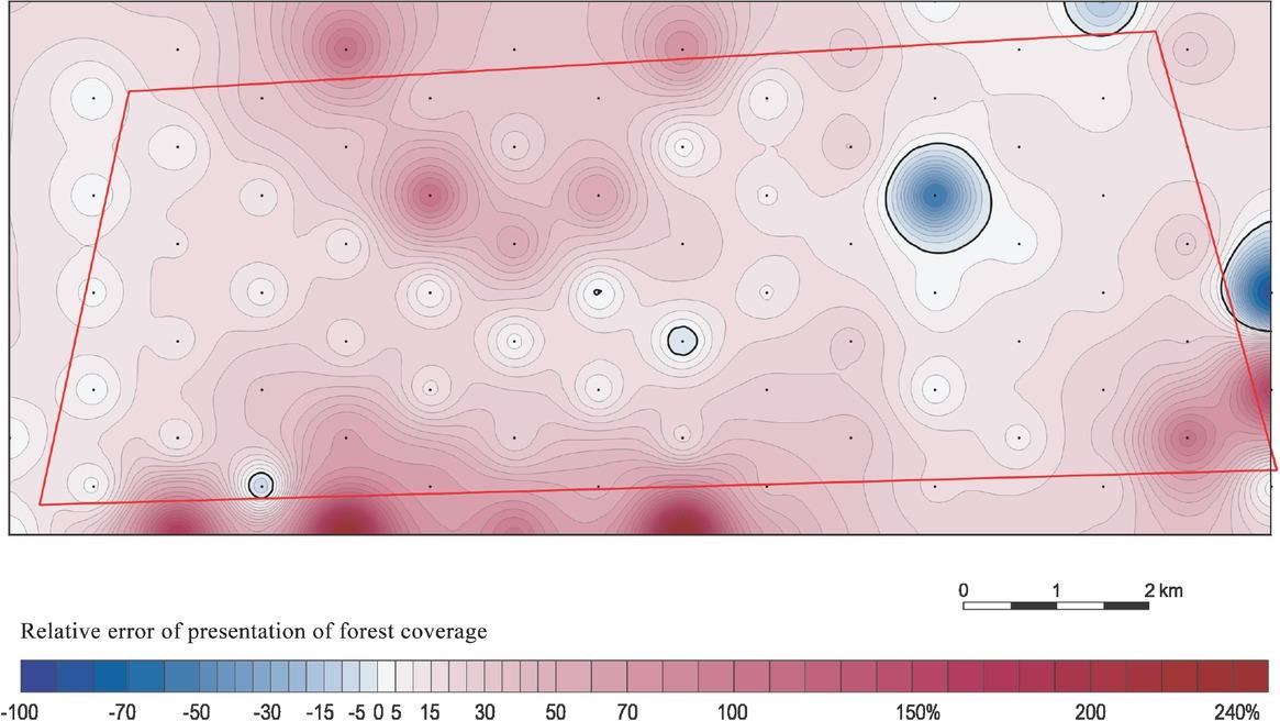 Errors expressed in the underestimated or overestimated map of forest coverage (Fig. 4) are in the range of -2 to 8 ha. The total error involves an overestimation of forest coverage by 56.43 ha (1.38%). The highest values are observed in the boundary belts of the compact forest complex where error values are positive, averaging approximately 3 ha. The values are seemingly low, but referencing them to the surface area of 100 ha (1 km2) of the sampled primary field shows that 3% of its surface was incorrectly defined. The tendency for overestimation of forest coverage is evident.