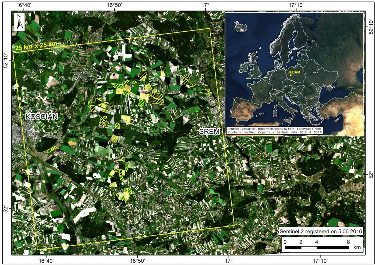 The cropland test site is located in western Poland (Fig. 1), within the administrative area of Wielkopolska voivodeship (NUTS-2 PL41). Wielkopolska lies within the Odra river basin, however, 88% of the province's surface water drains into the Warta river basin. The flat terrain reaches elevation ranges of 60 to 90 meters. The western part of Wielkopolska is influenced by oceanic air masses that affect the mildness of the climate. On the other hand the eastern region of Wielkopolska is under the influence of a more distinctly continental climate. The average temperature for the year is approximately 8°C. The growing season is one of the longest in Poland: the southern plains are characterized by a growing season of around 228 days, while the northern region gradually declines to 216 days. Precipitation ranges from 500 to 550 mm per year (Gurdak & Grzybowski 2018).