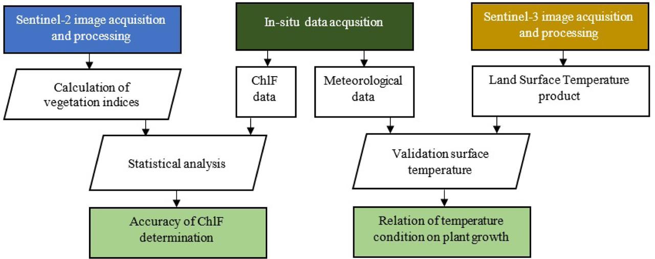 Chlorophyll fluorescence is widely used to monitor crop stress, while multi-frequent satellite observations allow for the retrieval of parameters such as pigment concentration and photosynthetic active radiation (PAR), which can be used for ChlF estimations. It is known that crop yield can be reduced by stress factors such as extreme temperatures, direct sunlight, and a shortage of water and nutrients (Baligar et al. 2001; Dąbrowska-Zielińska et al. 2011), which affect or block plants’ metabolism, growth, and development (Kranner et al. 2010). Compared to reflectance, induced fluorescence is considered to be a more accurate indicator of plant state and to be able to detect stress impacts at earlier growth stages (McFarlane et al. 1980; Kancheva 2008).