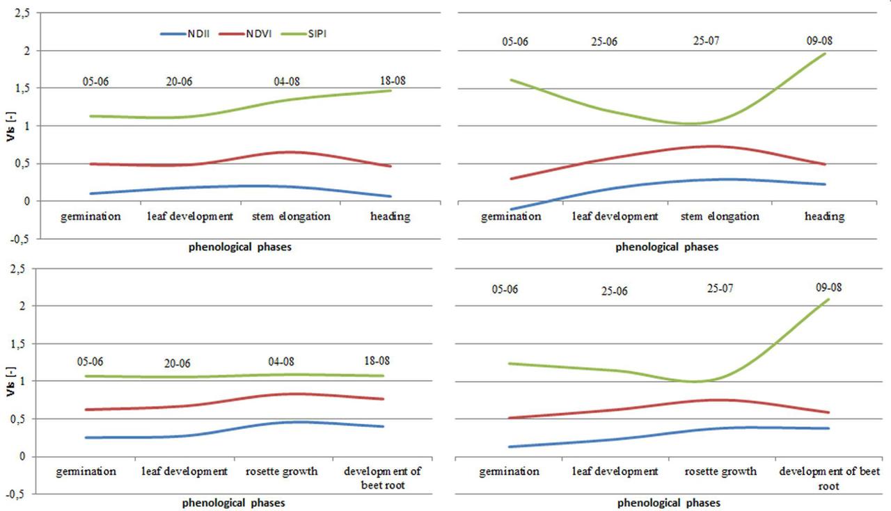 EVI and S2REP indices are desirable indicators for monitoring photosynthesis (or chlorophyll content), while the SIPI index (related to the amount of active light) and NDII (related to water content) better reflect stress conditions and ChlF. High SIPI values (increased carotenoids and decreased chlorophyll) are often an indicator of plant disease, which is associated with loss of chlorophyll in plants. Therefore, there is a negative correlation with the SIPI index, which provides information about stress conditions. The worst results in sugar beets may be caused by the fact that the signal acquired by the satellites was not homogeneous. Sugar beet leaves do not cover soil background signals, while the top canopy of maize cover the bare soil under them, especially in areas of dense canopy.
