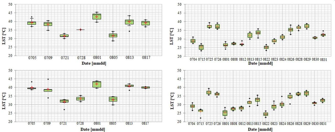 The temperature readings from the measurement points were made on the basis of the Sentinel-3 LST data. Next we carried out a series of descriptive statistical calculations, which were presented on box plots (mean (red cross), median (black line in green box), maximum and minimum (upper and lower whisker), outliers (black dots), 1st quartile and 3rd quartile (sides of green box)) on surface temperature data (Fig. 5) on fields with sugar beets and maize within the JECAM area. The 1km gridded Sentinel-3 images showing temperature were primarily resampled as ten meter resolution images in order to compare the results with the Sentinel-2 based vegetation indices and find the relation between temperature conditions and plant growth.