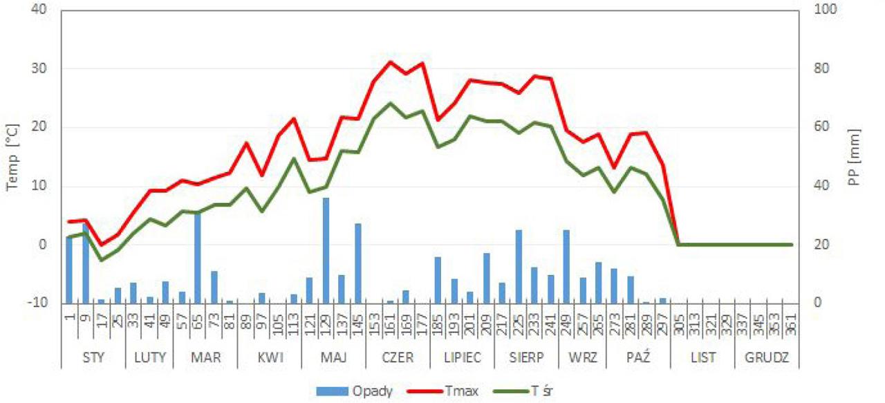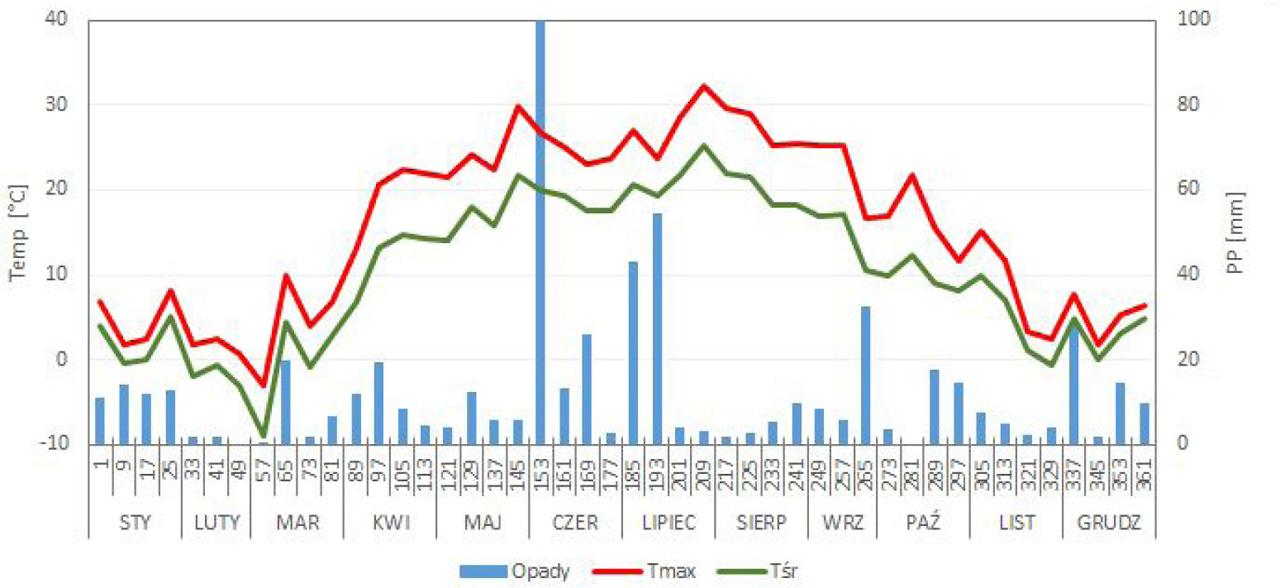 Maximum and mean temperature, as well as total precipitation, noted in 2019 at the meteorological station in the town of Kornik