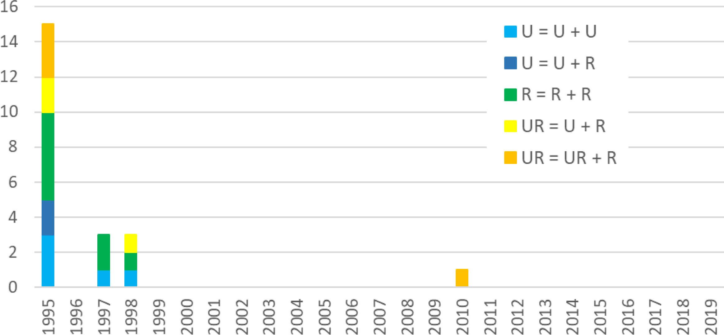 The subject of analysis in this article is the municipal splits since 1995 only, due to a problem accessing generally available data on previous years. In 1995 alone, 15 new municipalities were created. These were different types of changes: 5 urban, 5 rural and 5 urban–rural municipalities were divided at that time. The newly created local government units (secessionists) were primarily rural municipalities (12 out of the 15 cases of splits in 1995). Later municipal divisions were much rarer (Fig. 1). The analysed municipal divorces were not a result of a conscious policy of the Central Government (they were not part of a central policy programme), but rather occurred as a result of bottom-up pressure and singular initiatives from local political elites and local communities (Gendźwiłł, Kurniewicz & Swianiewicz 2020).