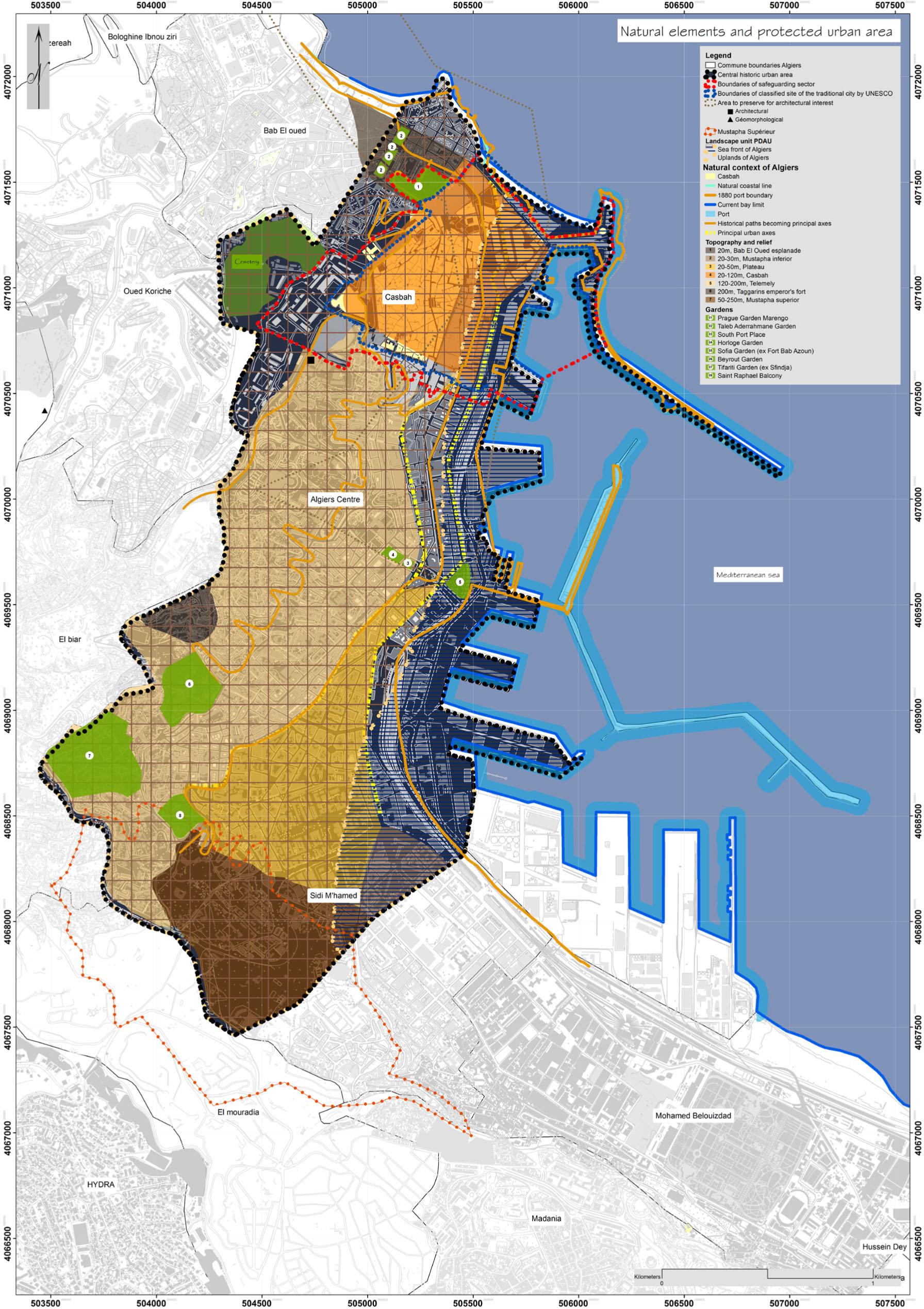 The focus of this paper is to consider the aggregated historical entities of the central historic urban area of Algiers as a system of components and, therefore, as a historical urban landscape. The central historic urban area is not a designated historic urban landscape and is therefore not protected by law. The task of identifying landscapes cannot be well-defined in a direct way because the balance between the sites’ types of values and attributions raises questions, and requires different approaches and levels of evaluation (Finotto 2011; Bottero 2011).
