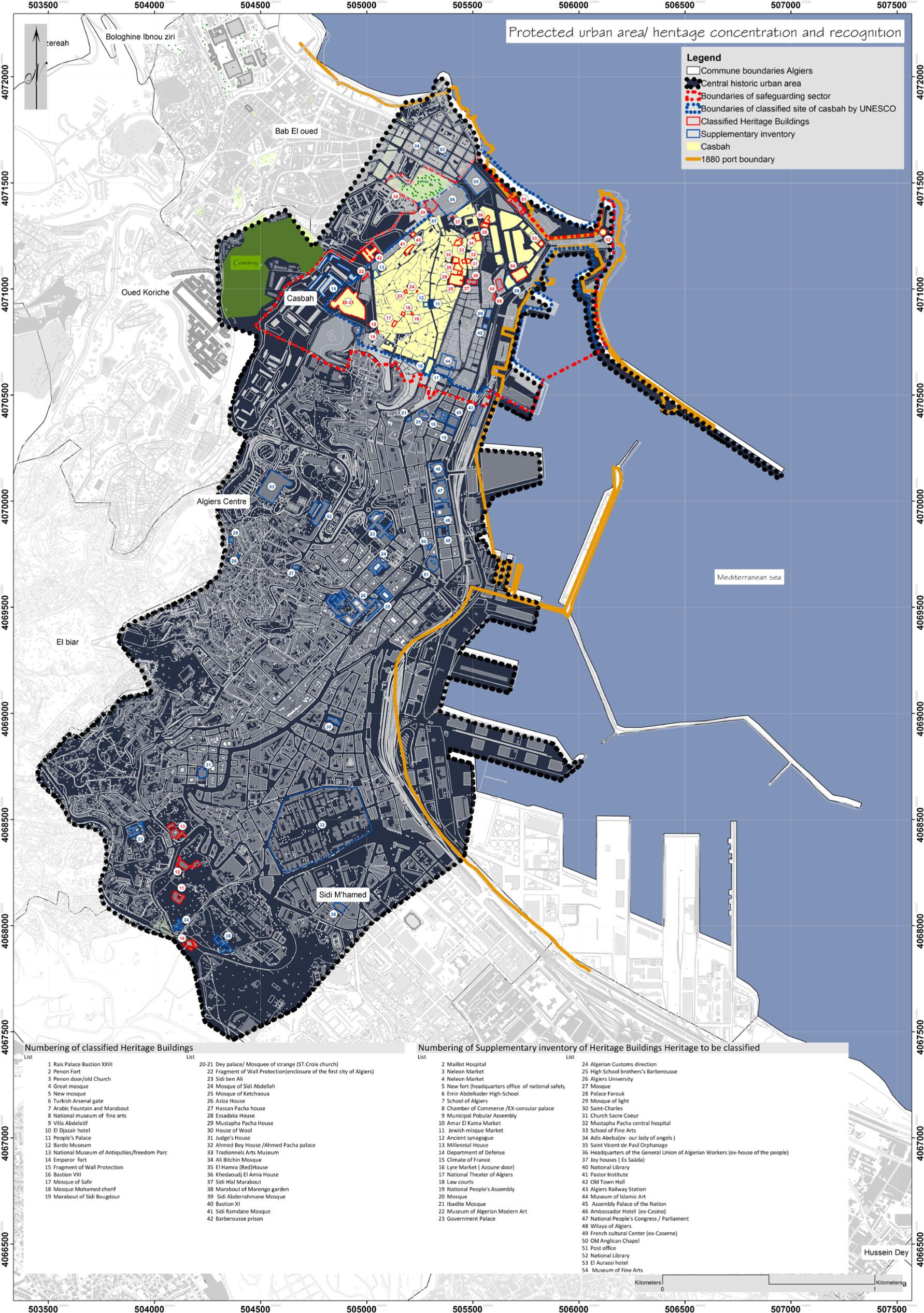 From the analysis of the urban fabric, the identification of the typology of the first nucleus of the casbah (Missoum 2003; Nacib.Y, Icheboudene.L 2003) is clearly confirmed by its structure and its urban organisation, which are integrated into the morphological context of the hilly site that dominates the bay of Algiers. The recognition of land use is an important factor in the assessment of the landscape (Morehart & Millhauser 2016) of Algiers as an economic capital city (Antrop 2004), which was, in the past, known as a big maritime city (Missoum 2003; Raverau 2007). Therefore, the formation of the central, historic urban area has raised up mechanisms related to the natural beauty of the site, the historicity of spaces (Chouquer 2000), and the concentration of places for decisions and activities (Fig 5). The data relating to the heritage safeguarding process was mapped using GIS (Dhingra et al. 2017) – sites and monuments classified as world heritage, the inventory of buildings for classification and the safeguard sector (PPMVSS 2007) – which permitted the concentration of heritage components to be observed, and the boundaries of the safeguarding sector and the boundaries of the classified sites to be distinguished (Fig 6). Furthermore, the divergence of the boundaries between the classified perimeter of the casbah and those of the casbah's safeguarded area raises problems with spatial use and the need to approach the entities together as a historical urban centrality (Dhingra et al. 2017).