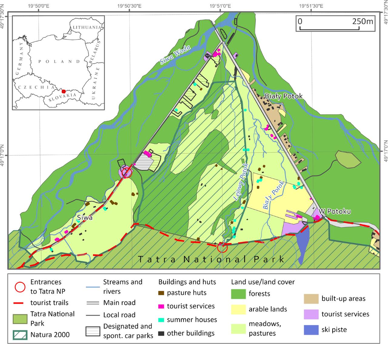 According to TNP (2020), in recent years the Tatra National Park has been visited by more than six million tourists per year, and the trend is increasing. The area is attractive due to the views of the Tatra Mountains and the seasonal flowering of spring crocus (Crocus scepusiensis). Most of the traditional agricultural landscape has been preserved here (arable land and pastures – 29%, forest complexes – 60%). Visitors are also attracted by the cultural value of the area, as the traditional pastoral economy and architecture of Podhale have been preserved. From a topographical point of view, the area is characterized by small slopes and is crossed by several watercourses. The central part of the area is protected under the Natura 2000 network (Polana Biały Potok PLH120026).
