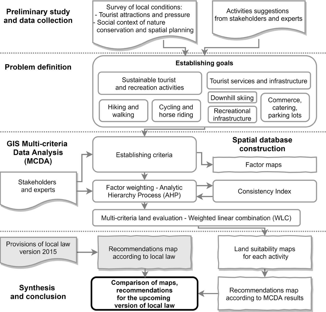 Sustainable tourism planning in the crowded neighbourhoods of natural resource protection areas incorporates multiple conditions, from environmental to economic or legal ones (Eagles et al. 2002). Providing convincing arguments allows the planners to arrive at decisions by employing a systematic and comprehensive framework while maintaining high transparency (Proctor & Drechsler 2006, Boroushaki & Malczewski 2010). In such cases (e.g. Ghorbanzadeh et al. 2019), Multi-Criteria Decision Analysis (MCDA) is widely used for decision support (Malczewski 2006). This offers a set of techniques that allow for the selection of the most suitable solution (or a set of solutions) in the structured analysis of decision-making problems (Boroushaki & Malczewski 2010, Gamper & Turcanu 2007). The synergy of the GIS and MCDA tools enables the inclusion of the spatial aspect in the analysis, and substantially facilitates communication among stakeholders in all aspects of the decision-making process (Chakhar & Martel 2003, Malczewski 2006).