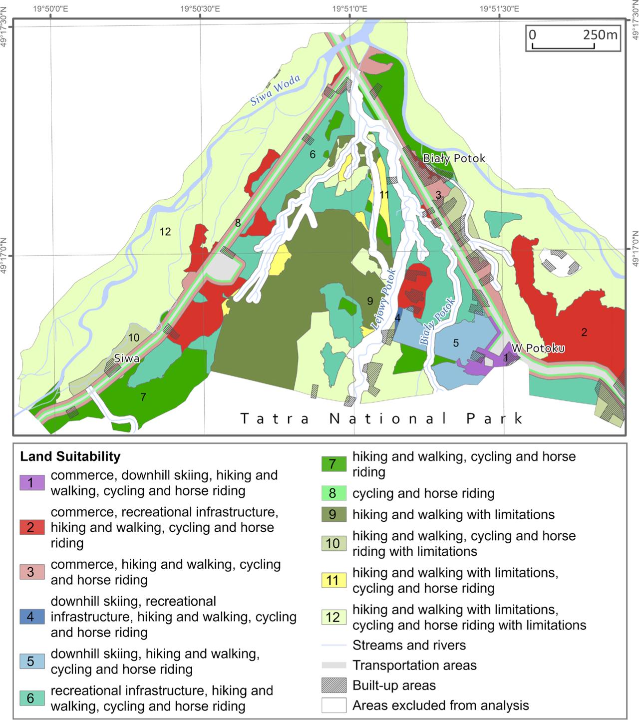 The WLC results for all the criteria were summarized in the land suitability map, which was to provide recommendations on the use of particular parts of the land for the anticipated activities. For this purpose, sites meeting the positive suitability criterion were selected from the WLC result layers. The following principles were followed: (1) for sustainable tourism activities, areas classified as highly attractive/suitable and suitable were selected – the suitable with limitations class was also taken into account, as the requirements to be met in an area falling within this class were realistic, for example the limitation of free forest penetration in the Natura 2000 area; (2) for downhill skiing, only the suitable with limitations class was applicable – the extent of these areas was further limited to areas that offered sufficient space to locate a downhill track of at least 300 m in length and they were located in the immediate proximity of roads; (3) for activities requiring investment, only areas in the highly attractive/suitable and suitable classes were selected due to their expected environmental and landscape impact.