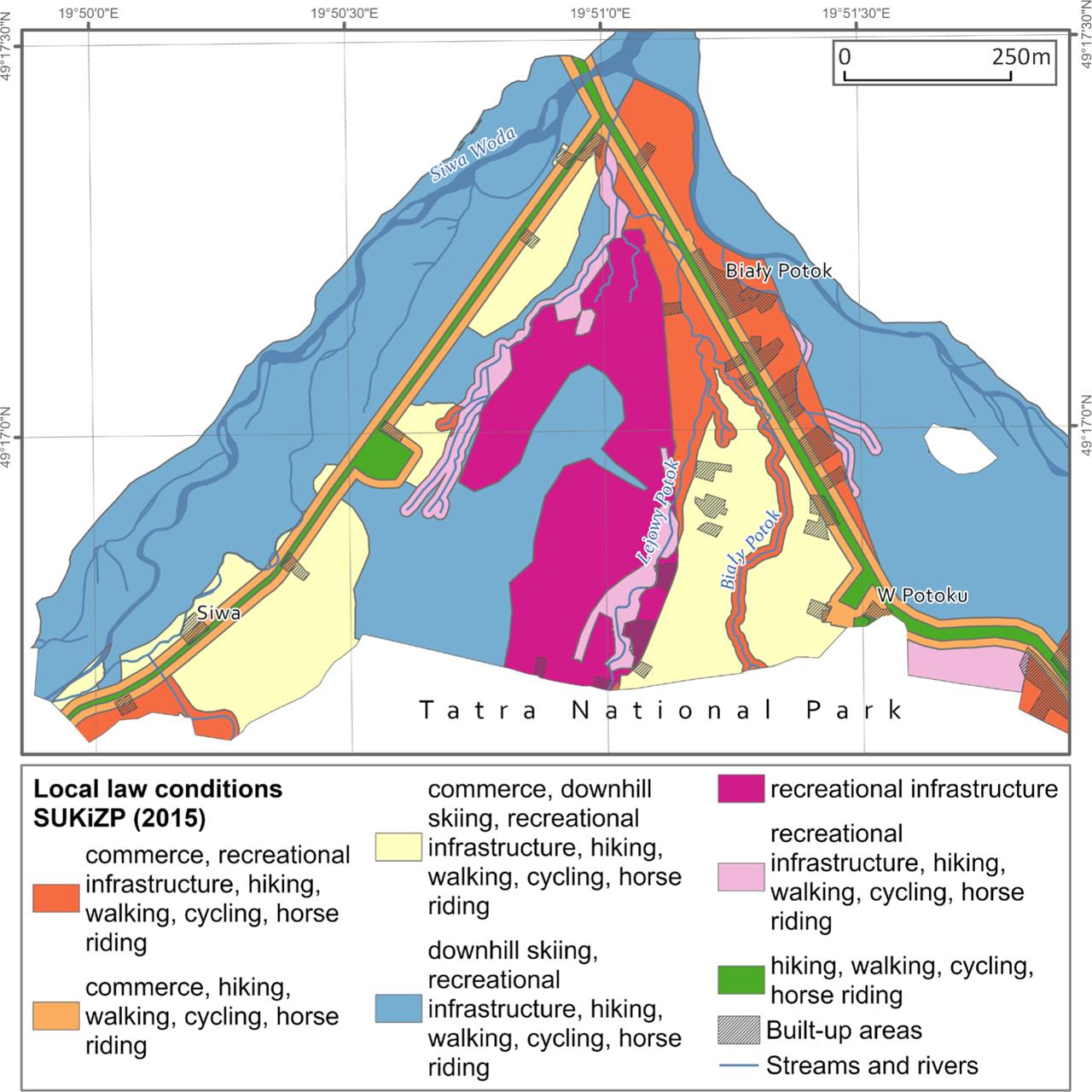 The planning conditions (Figure 4) define the area as generally suitable for tourist activities and for locating tourist infrastructure. Attention needs to be drawn to the non-specific provisions for active tourism and the location of recreational facilities for all areas, except transport and built-up areas. Since tourism in this area is becoming more popular and the number of tourists is increasing, the lack of regulations in this respect may result in a significant threat to its values. The same applies to the skiing infrastructure that is permitted everywhere, even in unsuitable areas. A particular paradox is that no restrictions are imposed on the Natura 2000 areas. Only the location of the tourist infrastructure facilities has been significantly limited in the planning records. Additionally, except for the streams, neither landscape features nor topography has been taken into account in the provisions.