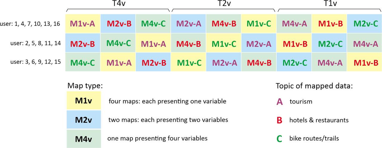 The bivariate extrinsic maps with configural and separable visual variables (M2v) did not differ in the majority of analysed metrics from the simple univariate maps (M1v). Therefore, applying a bivariate extrinsic map instead of a univariate series of maps should not affect the performance of experienced users. The results showed that the series of univariate maps (M1v) can be helpful for both simple (T1v) and complex tasks (T2v, T4v). However, four-variate maps (M4v) did not prove such wide usability with regard to task complexity, whereas bivariate maps with separable variables (M2v) turned out to be a competitive solution for both simple (T1v) and complex tasks (T2v, T4v). Therefore, the cognitive load connected with multivariate mapping affected the performance of expert users only in the case of the four-variate intrinsic map.