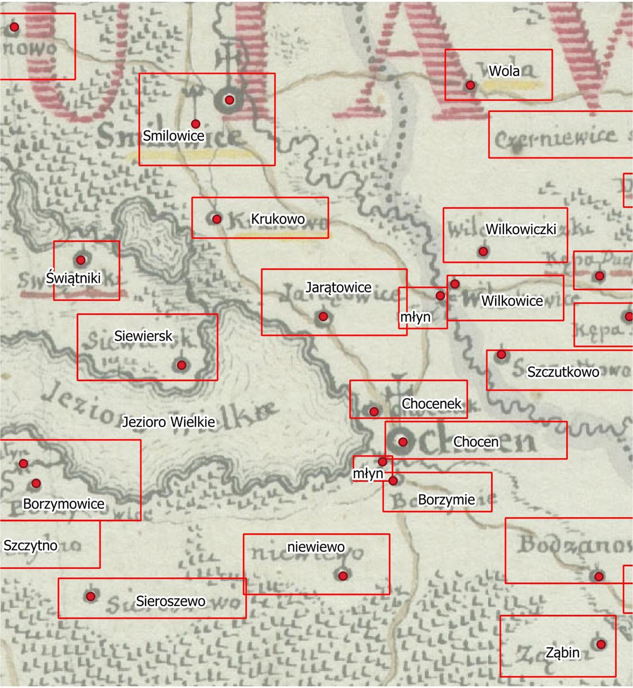 One of the key decisions regarding the indexation was to separate map symbols from map annotations and to collect them in two different tables: Symbols and Annotations respectively. Preliminary studies have shown that it is often difficult to clearly link a symbol (e.g. village or mill) to its description (e.g. village name) (Fig. 8). The method of indexing topographic features by treating them as a composite of the location, type, and name, would therefore fail to apply in our work. The entities collected in the Symbols table are a vector representation (point) of cartographic symbols forming the map content. This list was derived from the map legend, but categories that were not included in the legend are also included. In the Annotations table, toponyms are collected together along with transliterations and transcriptions. Their types are classified according to the typeface used on the maps, for example, italics, antiqua (standard, larger), small caps, and all caps.
