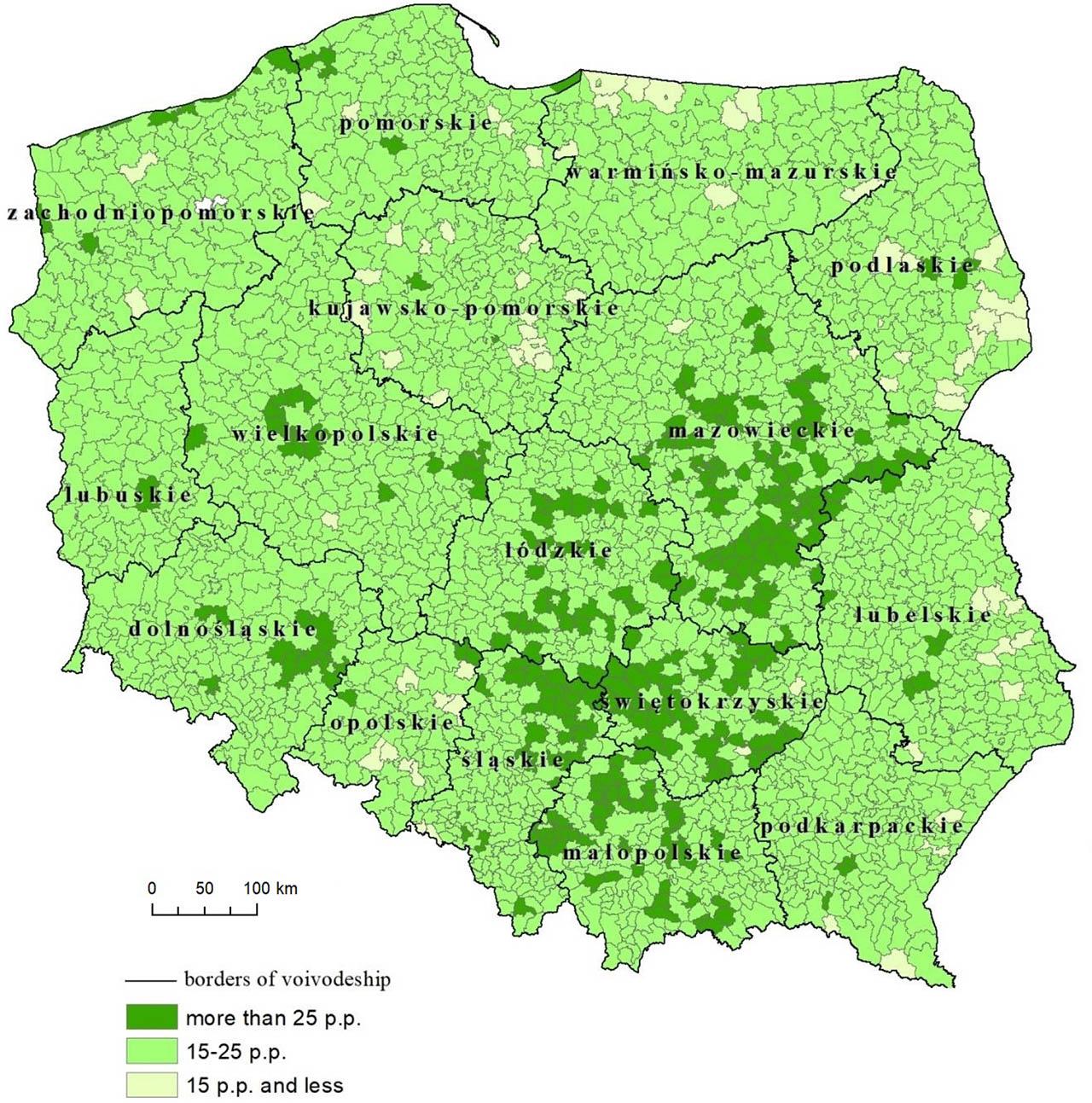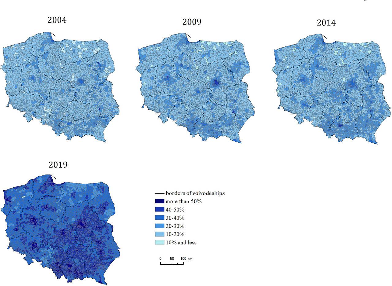 The increased turnout in the 2019 EP election was uniform throughout the country (the standard deviation was 1.5), although it was higher in some areas. The national average increase in turnout was 21.85 p.p. The increases were largest in the voivodeships of Mazowieckie (24.46 p.p.), Świętokrzyskie (23.46 p.p) and Łódzkie (23.2 p.p.), and smallest in Kujawsko-Pomorskie (19.16 p.p.), Podlaskie (19.31 p.p.) and Warmińsko-Mazurskie (19.84 p.p.). The largest increase was recorded in Gmina Wiśniowa in Małopolskie Voivodeship (31.44 p.p.) and the smallest in Gmina Kikół in Kujawsko-Pomorskie Voivodeship (4.69 p.p.) (Figure 3).