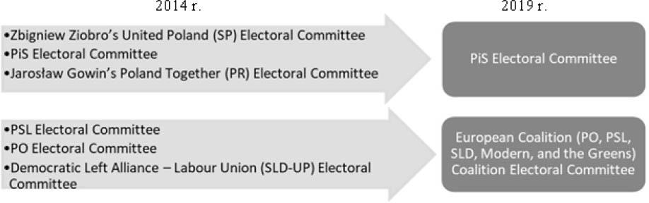 It can be instructive to analyse the change in support for particular parties against the background of this increase in voter turnout. Twelve electoral committees, of which ten were party committees and two were coalition committees, stood for the 2014 EP election. (10) Five committees obtained mandates: PiS and PO – 19 each; SLD-UP – 5; and the Congress of the New Right (KNP) and the Polish People’s Party (PSL) – 4 each. In 2019, several political parties consolidated to contest the EP election as coalitions or single parties (e.g. Jarosław Gowin’s PR and Zbigniew Ziobro’s SP contested the election on the PiS lists). Many committees did not contest the election, but new ones made appearances. Only four obtained mandates. PiS and the European Coalition (KE) obtained the most. The changes in support for particular committees were analysed on the basis of the results for the main winners in 2019, i.e. KE and PiS. This was necessary in view of the extensive changes in the political scene between the 2014 and 2019 elections. The 2014 results have accordingly been aggregated as follows: