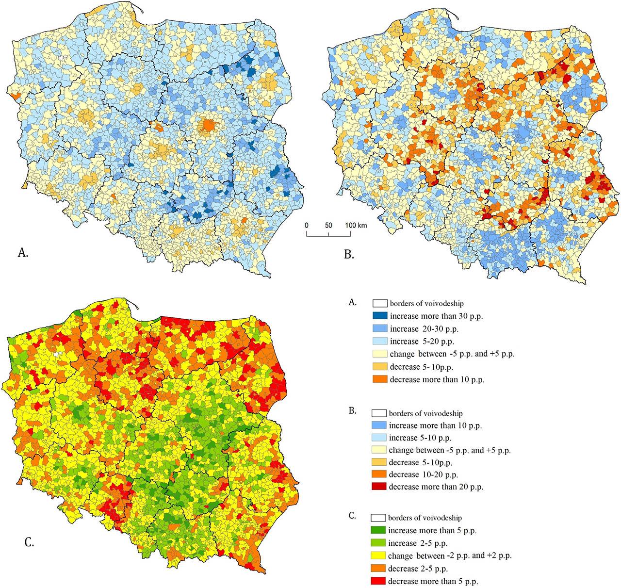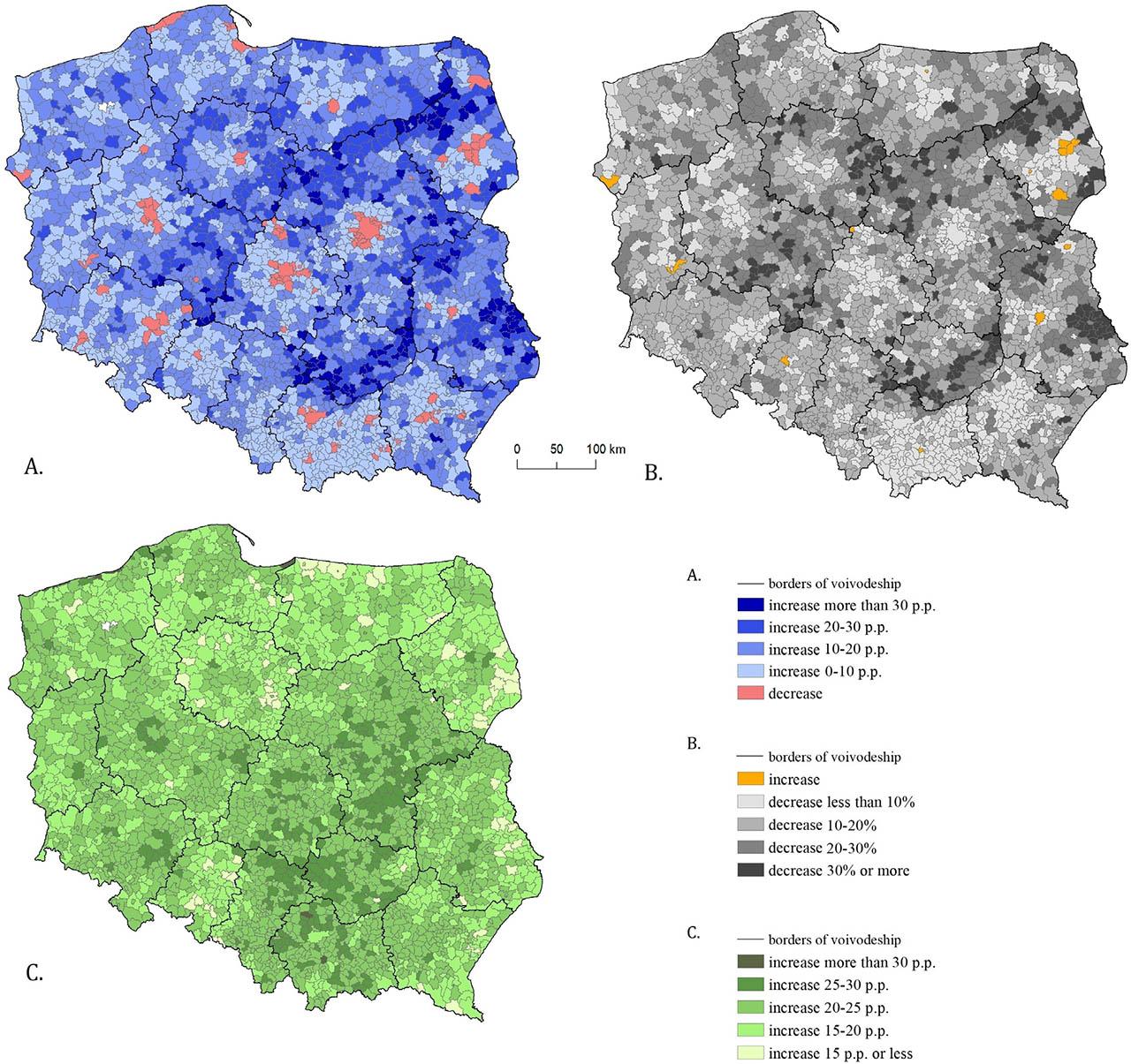 Change in EP election results from 2014 to 2019: A – support for PiS; B – support for KE; C – turnout