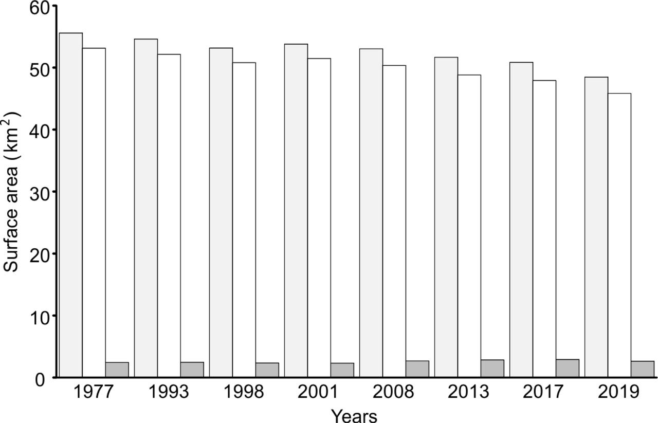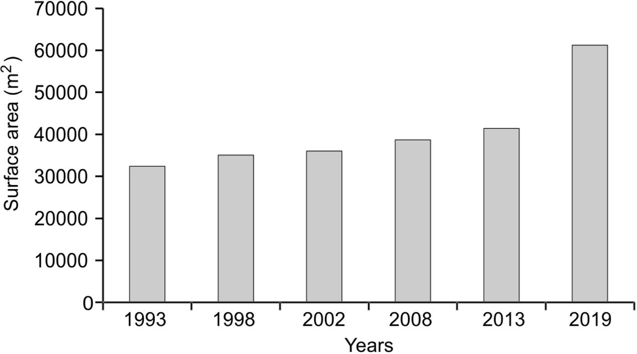 List of Landsat satellite scenes used_ MSS: MultiSpectral Scanner (Landsat 1), TM: Thematic Mapper (Landsat 5), ETM+: Enhanced Thematic Mapper + (Landsat 7), and OLI: Operational Land Imager (Landsat 8)_ “Date” shows day_month, and “P-R” shows path-row_ Source: USGS Earth Explorer
