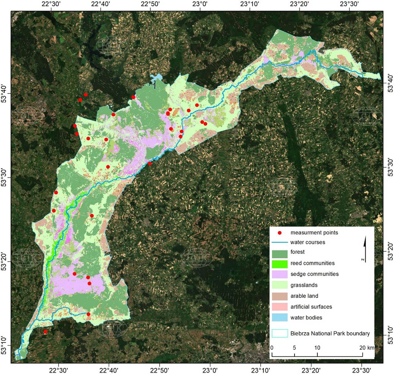 The Biebrza Wetlands are located in Central Europe, in the north-eastern part of Poland. The marsh area is located in the Central European Lowlands, the appearance of which was dominated by the last glacial period. There are many fluvioglacial deposits here, which influence the present landscape, also shaping the water relations and, consequently, the flora and fauna of the region (Okruszko 1990). Under the Biebrza Wetlands, there are impermeable strata – smelting depressions left by the ice sheet that caused the creation of the marshes. The species composition of wetlands is extremely diverse (both in terms of flora and fauna), even unique in Europe – there are more than 70 natural and semi-natural plants, including sedge, sedge-moss, reed communities, and mineral islands. For this reason, this area is guarded by numerous conventions, including Natura 2000 and RAMSAR (since 1995), as well as being placed under Polish protection as a National Park in 1993. The legally protected area covers a total of 59,233 ha, in which 15,547 ha of forests, 18,182 ha of agricultural land and 25,494 ha of wetlands (the most valuable habitats of the park) can be distinguished. The main source of water for the fen is the Biebrza River. It spreads widely at higher water levels, with a small slope where it flows into the larger river – the Narew (Batelaan et al. 2009; Berezowski et al. 2019).