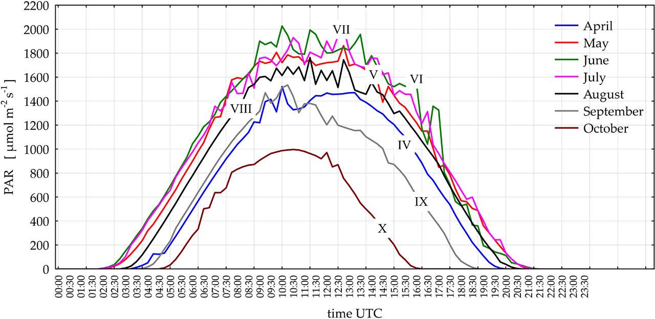 One of the most important parameters measured in the Biebrza Wetlands were meteorological parameters. The station was located on a flat, homogenous marshland site within the Biebrza National Park, and covered unmanaged sedges with moist organic soil. The following parameters were measured: photosynthetically active radiation (PAR – Fig. 2), air temperature, relative humidity, leaf wetness, wind speed and direction, atmospheric pressure, soil moisture and precipitation.