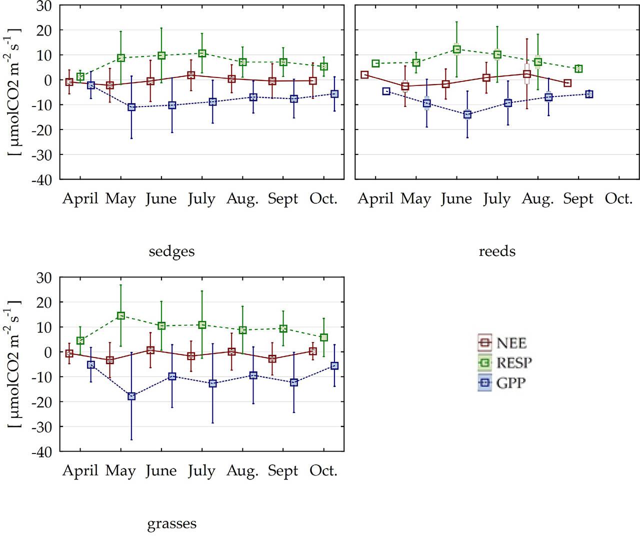 Figure 3 illustrates the chamber measurements of NEE, RESP and GPP calculated (eq. 1). The course of monthly averages of NEE, RESP and GPP were observed at 28 sites, on grassland, sedge and reed communities. It can be seen that the ability for both photosynthesis and respiration is larger for grasses. In May, they are the highest for grasses and sedges, and for reeds in June. The net absorption is also highest in May.