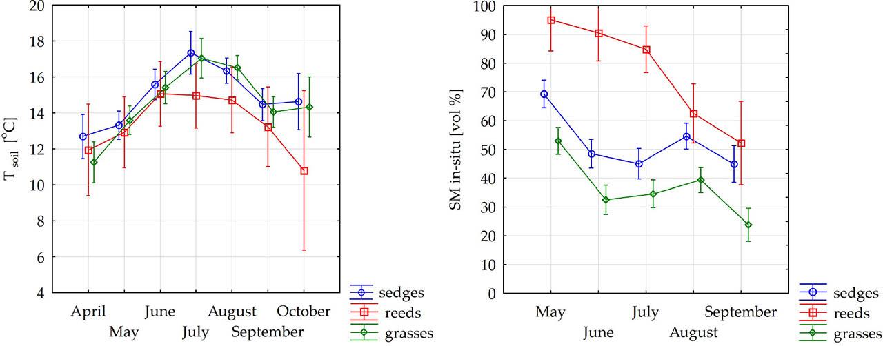 Soil temperature (left) and soil moisture (right) measured in situ in Biebrza habitats in monthly cross-sections (means and 0.95 confidence interval)