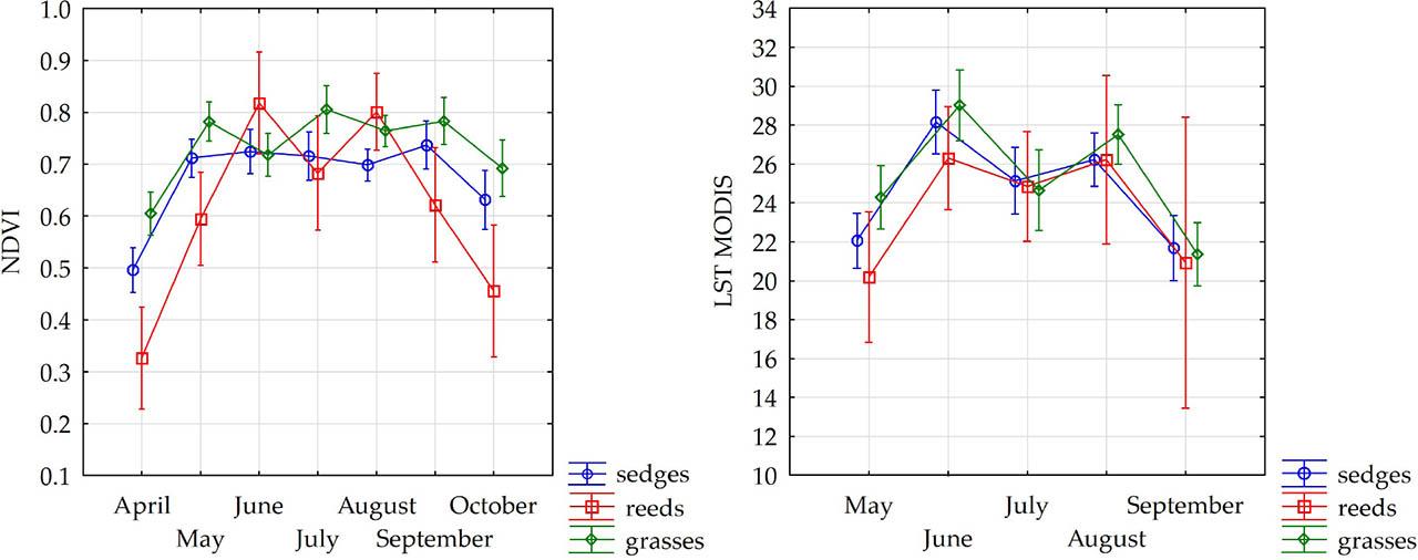 In May, the NDVI for the grass habitat is higher than for sedges, which reflects the more intensive vegetation (Fig. 5). In June, the situation is the reverse – sedges achieve the higher dynamic of vegetation, grasses enter the senescence phase. The significant difference in LST (Land Surface Temperature, defined also as Ts from satellite data) in May and June is related to the distribution of soil moisture in the habitats (Fig. 5).