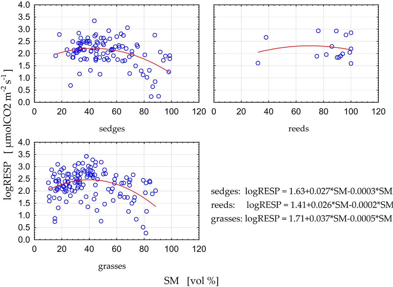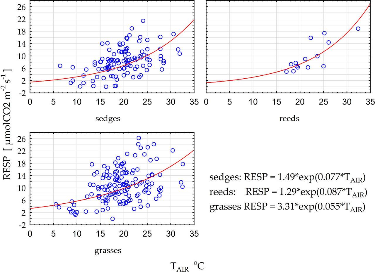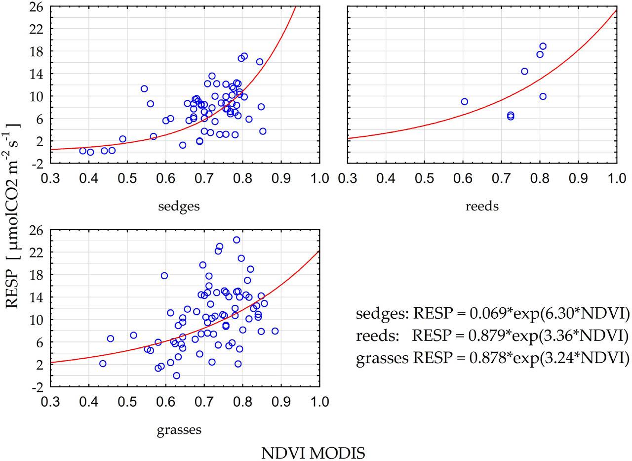 The exponential dependency of ecosystem respiration with air temperature TAIR measured in black chambers (Fig. 6), as well as with satellite-derived NDVI index (Fig. 7) was investigated. However, the dependency of soil moisture SM has a polynomial character (Fig. 8). The highest respiration took place where the soil moisture was in the 40–50% range. If it is above 80% in sedges and grasses, it has an inhibitory effect.
