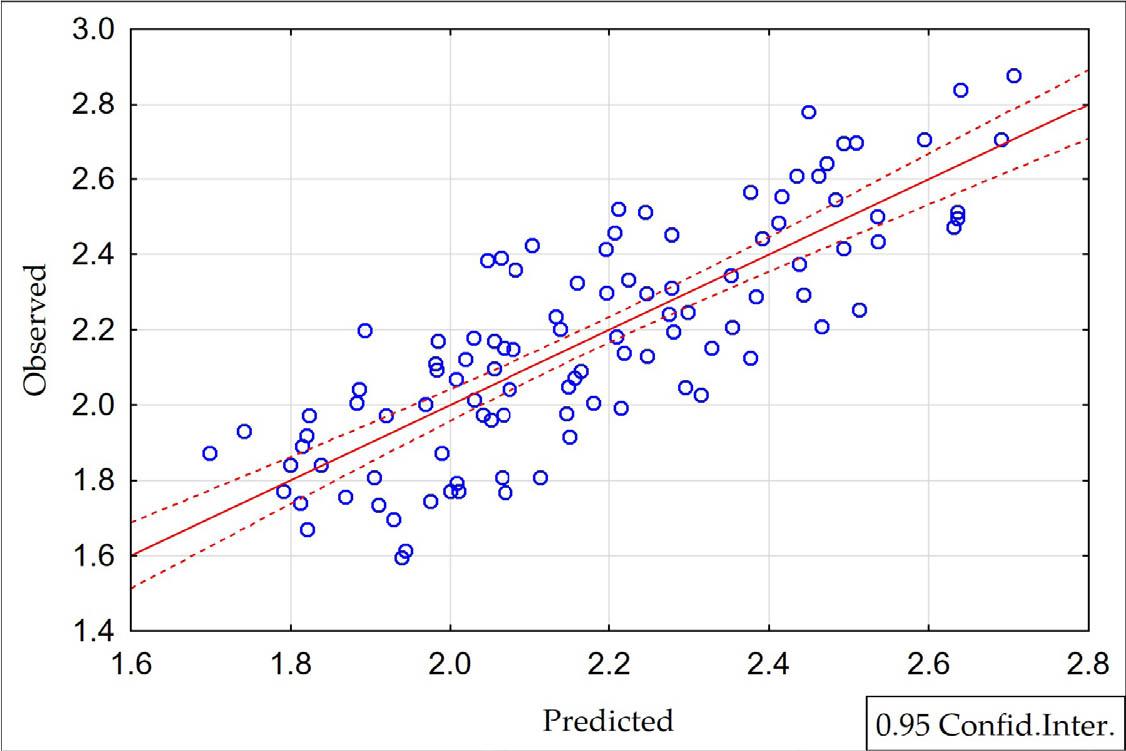The goodness-of-fit statistics of the log-linear regression are R = 0.81, RMSE = 1.2 μmol CO2 m−2 s−1, N = 105. There is mutual independence of the equation components R2 = 0.02, so the tolerance is on the level R2 = 0.98.