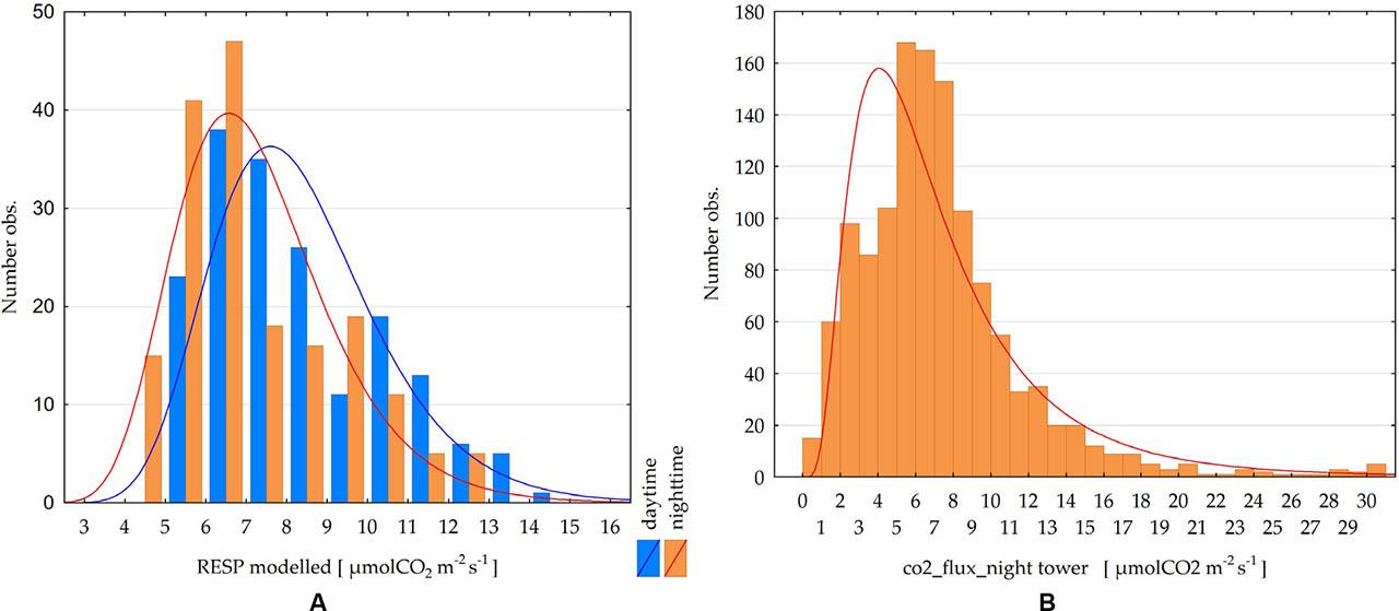 A (left): Distributions of daytime and nighttime means of respiration calculated with the model (4) for chamber observation points. B (right): Distribution of nighttime values of respiration from EC tower measurements for the period May–September