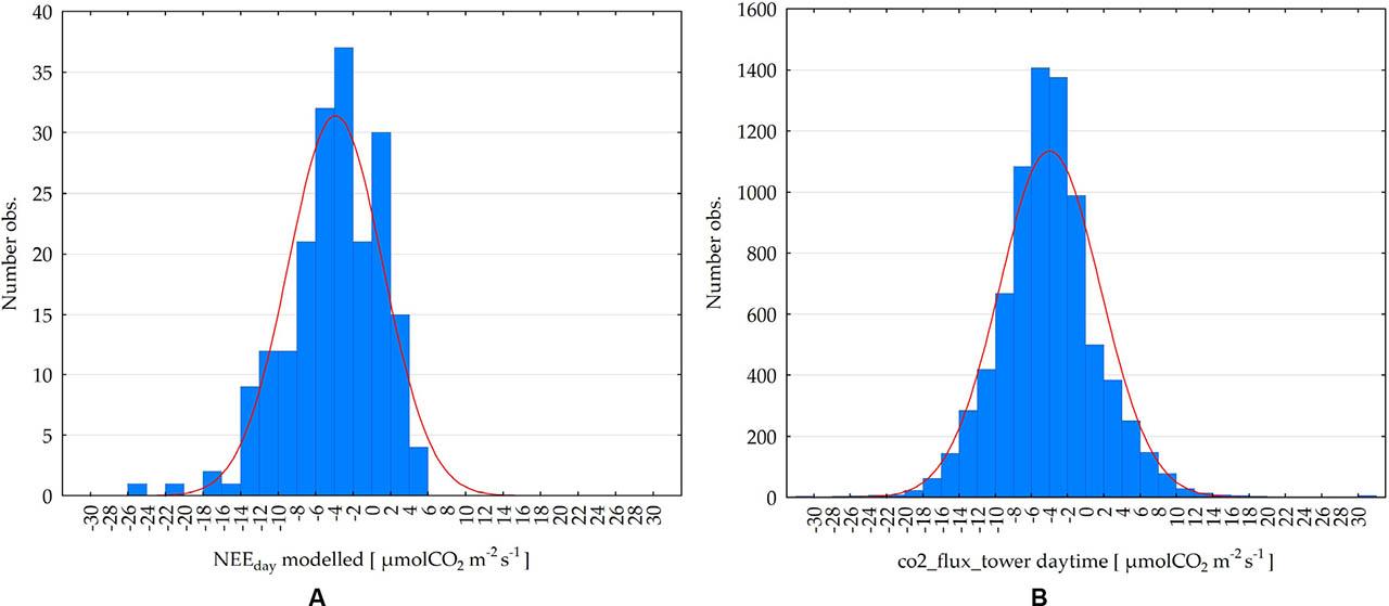 Figure 11 presents the comparison between the distribution of the daytime EC tower CO2 flux and daytime NEE modelled by (eq. 5), where RESPnight is omitted, as in the formula below: