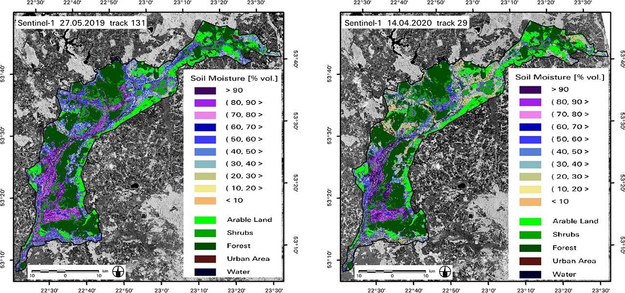 The maps on Figure 12 have been chosen to illustrate the results of calculating the Biebrza Wetlands soil moisture in the wet time (May 2019) and dry time (April 2020).