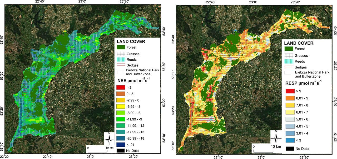 This study describes the method of determining NEE using satellite indicators such as NDVI, LST and NDII, and meteorological environmental parameters Tair, Tsoil, for soil moisture (SM), the model based on Sentinel-1 data. The model (eq. 8) gives the spatial distribution of daily NEE for each pixel covering three types of vegetation habitats at Biebrza wetland area. The differentiation of phenological development and moisture conditions between the habitats translates into CO2 exchange; the distribution of the daily NEE values generated by the model in the observation points is consistent with those measured at the data EC tower. Two fluxes making up the CO2 exchange, GPP and RESP, were estimated. The precision of the daily GPP model, using MODIS NDVI and Ts-Ta as the parameters, is 1.4 μmol m−2 s−2; using Sentinel-2 NDVI and NDII is 1.7 μmol m−2 s−2. The precision of the instant RESP model, using NDVI and soil temperature, air temperature and soil moisture, is 1.2 μmol m−2 s−2.