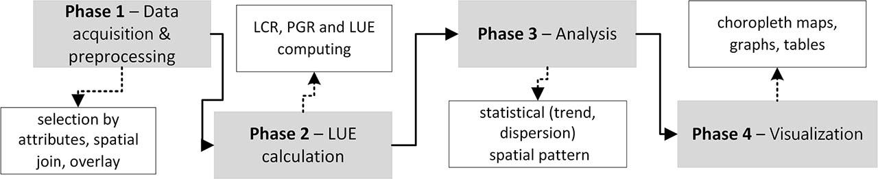 The methodological framework of cartographic modelling was the basis of LUE computing, analysis and mapping. Cartographic modelling provides a standardized procedure for data integration, spatial operations, and analyses, along with the results visualization in the form of thematic layers, maps, tables and reports by means of GIS tools. The study was conducted in four consecutive phases (Fig. 2).