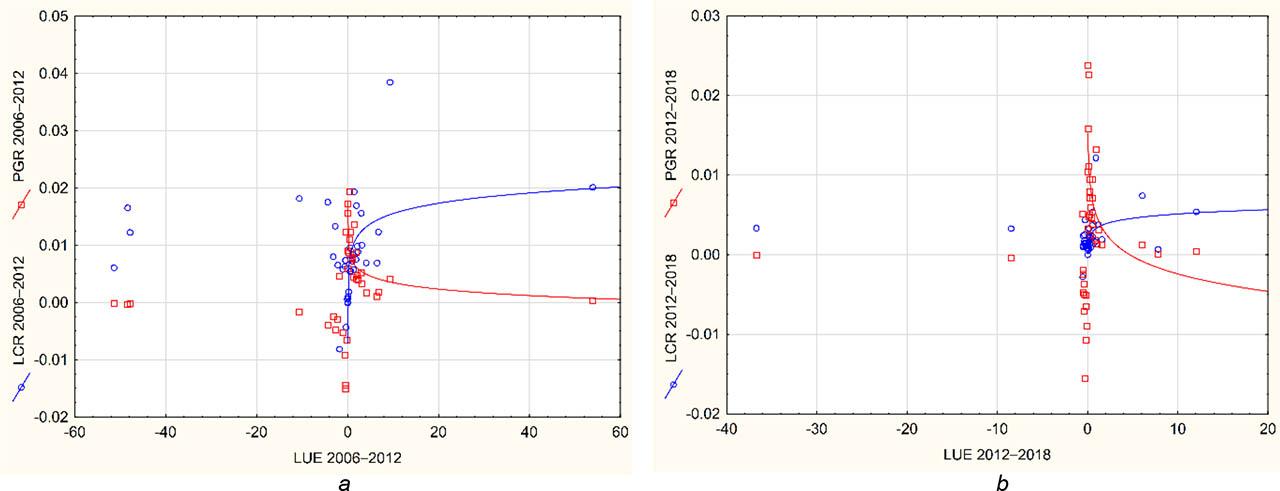 Relation of LCR and PGR to LUE 2006–2012 (a) and 2012–2018 (b)