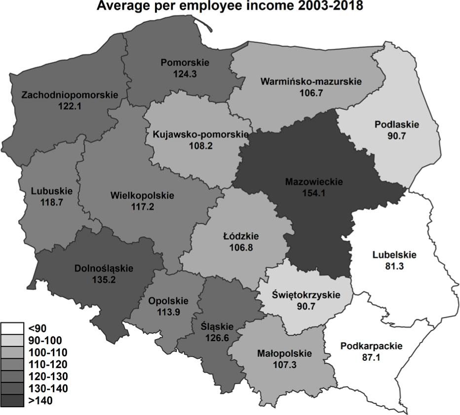 Average values of per employee income in thousands of PLN in Polish regions in years 2003–2018