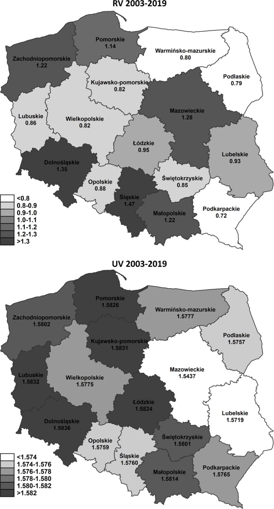 Maps of average RV and UV in Polish regions in years 2003–2019