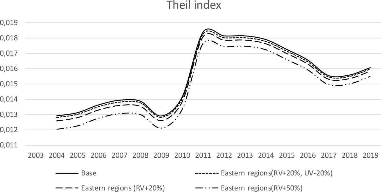 In order to study the effects of RV and UV on regional inequality, based on the estimation results (variant 3 – all regions), we calculate the estimated per employee income in each region and the Theil index for Poland at the regional level. (8) We then perform numerical simulations on how a change in RV or UV values in the regions of Eastern Poland would affect income inequality. We consider three possible scenarios: (i) increasing RV by 20% in eastern regions, (ii) increasing RV by 20% and reducing UV by 20% in eastern regions, and (iii) increasing RV by 50% in eastern regions. The results of simulations are shown in Figure 3.