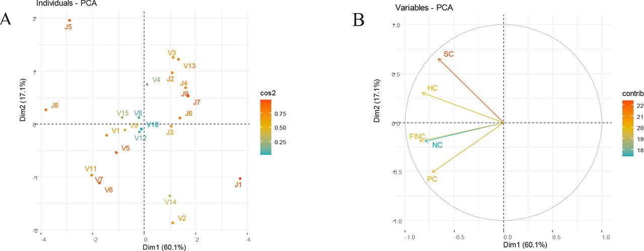 A: Correlation of the livelihoods of the families from Ventaquemada (V) and Jericó (J). B: human capital (HC), social capital (SC), financial capital (FINC), natural capital (NC), and physical capital (PC)